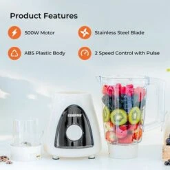 POWERFUL COPPER MOTOR- The 500W power of this 2 in 1 multifunctional blender allows you to cope with hard fruits & vegetables, ideal for creating quick, easy, nutritious drinks and smoothies on the go – simply load, blend and go! Create delicious smoothies and shakes, blend soups and sauces with confidence. 1.5 L PLASTIC JAR CAPACITY – with a jar this big you can blend huge amounts of fruits, vegetables, coffee & Spices. It helps to save time on cutting fruits or vegetables & instantly get a glass of tasty & healthy juice within a few seconds, and allows larger portions of soups or smoothies to be made at once, perfect for batch cooking or serving a family. 2 SPEED CONTROL WITH PULSE, SAFETY LOCK – Keep control over your blending and juicing creations with the dual speed functions. And with Pulse function it gives option to use full blade speed in bursts to blend hard chunky ingredients quicker. STAINLESS STEEL CUTTING BLADES – With these long span blades made of stainless steel, you can cut all kinds of fruits and vegetables. Simple to use, suitable for any level of kitchen confidence, and can create healthy and nutritious drinks in a matter of minutes. Enjoy healthy life to make fruit and vegetable juices, milkshakes, smoothies, cocktails and more in a short time., and be on your way to the gym, class or office. 2 YEARS WARRANTY INCLUDED, VERSATILE – With the choice of chopping, blending, mixing, and grinding to produce all types of textures to tantalise your taste buds.