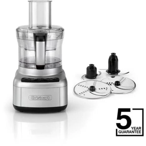The Cuisinart FP8U Easy Prep Pro food processor comes with large and small high-grade stainless steel blades and reversible discs for fine and medium grating, 2mm and 4mm slicing and there are 3 speed settings to select from. There is also a large feed tube and the silicone feet will ensure the food processor will not move around when in use.