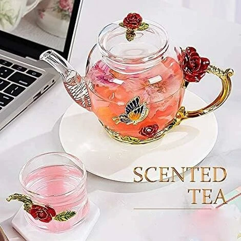 Glass Teapot – 280 Ml – France Enamel Rose Flower Butterfly Decoration Heat Resistant Glass Teapot Kettle With Strainer For Blooming Tea Loose Leaf Tea (Red, Single Teapot)
