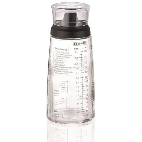 With the Dressing Shaker from Leifheit, mixing an exquisite salad sauce is simple and easy. Unlike most other dressing shakers, it has an anti-drip spout. This guarantees nothing gets lost and that work surfaces and hands stay clean. The shaker’s high-quality glass is printed with a measuring scale in ml and fluid oz. as well as with practical recipe scales. You’re thus always guaranteed to have the right mixture and the recipes are always to hand all without a single extra measuring jug. The filling volume of 300 ml is also sufficient for large quantities. The glass and product label are both dishwasher safe. Thanks to the securely fastening plastic lid, the shaker can also be used to store salad sauces.