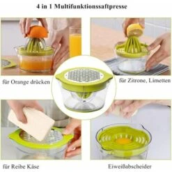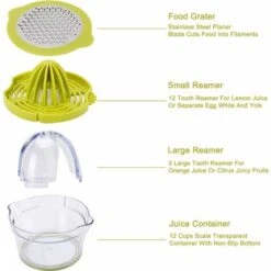 - 4 in 1 Orange Squeezer – The juicer consists of two reamers of different sizes, a grater and a 400ml fruit container. The transparent large reamer of the juicer is suitable for making orange juice and grapefruit juice; Small green orange juicer reamer is suitable for lemon and strained egg white. The diameter of the juicer is 14.5 cm, the height is 7.5 cm and the size of the grater is 14.5 x 12.5 cm. It can grind ginger and garlic into pieces.