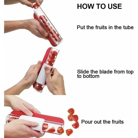 Just put the fruit into the tube, and gently slide the white tube on the periphery, the fruit will be easily split from the middle to two, clean, tidy and safe.
