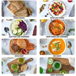 ACCESSORIES INCLUDED – Extra-large feed tube, triple pusher, stainless steel blade, BlenderMix, dough blade, egg whisk, 2mm slicing / grating disc, 4mm slicing / grating disc, spatula, storage box, recipe book.