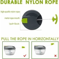 [Strong and Durable]: This mini food processors is made of food-grade PP plastic, which can safely produce a variety of food for your family. The blade is made of stainless steel which can even make the minced meat easily, and the overall structure is very strong. [Operation Steps]: 1. Cut the food into small pieces then put it in the box; 2. Close and tighten the lid towards the left ; 3. Pull the handle several times to chop the food; 4.Pour out the chopped food from the food chopper and put it into the bowl. This vegetable chopper is suitable for cutting celery, ginger, carrots, tomatoes, onions, garlic, peppers, fruits and meat, etc. [Design Details]: This food chopper adopts an ergonomic design. You can press the body of the chopper with one hand and pull the pull-tab with the other hand to ensure not shake while using. The capacity is 500ml, which can meet the needs of processing different food at the same time. The weight of the product is only 210g, which is very light,It is easy to carry and you can store it in anywhere. The pull-tab design of the handle prevents slipping during use. [Easy to Clean]:The blade, cover and bottom body of this vegetable cutter are detachable for easy cleaning,It can be rinsed under running water, but it cannot be rinsed in a dishwasher, moreover,in order to avoid residual food residue becoming hardened, it is recommended to rinse with water after using directly. [Suitable for Kitchen]: This highly efficient and multifunctional vegetable cutter is not only suitable for home kitchens, but also for professional kitchens. It can be used to chop vegetables, fruits, meat, etc.It is a good helper for the kitchen.