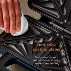 Power on and Ready-to-Go indicator lights take the guesswork out of when your sandwich is cooked whilst the automatic temperature control allows evenly distributed heat for consistent cooking. Cool touch handles and a locking catch provide additional safety when in use.