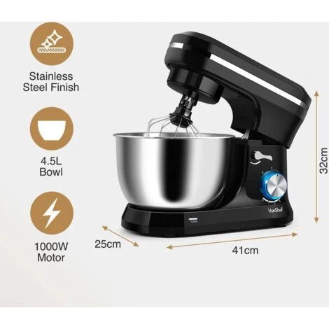 Ideal for new bakers and seasoned professionals, the VonShef Stand Mixer makes baking simple. Designed to be low on noise and high on power the impressive 1000W motor – makes lightwork of mixing, whisking and kneading.Â